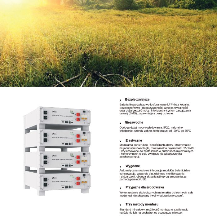 • Bezpieczniej : nasz  akumulator LFP zapewnia zwiększone bezpieczeństwo i długą żywotność, przy wysokiej wydajności i gęstości mocy. Inteligentny system zarządzania baterią (BMS) zapewnia pełną ochronę i spokój ducha.
