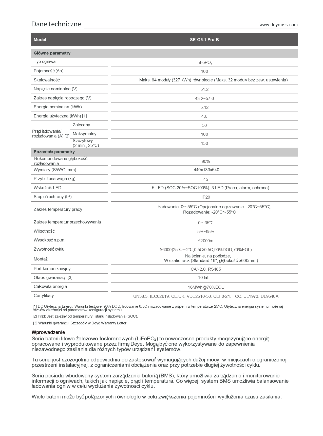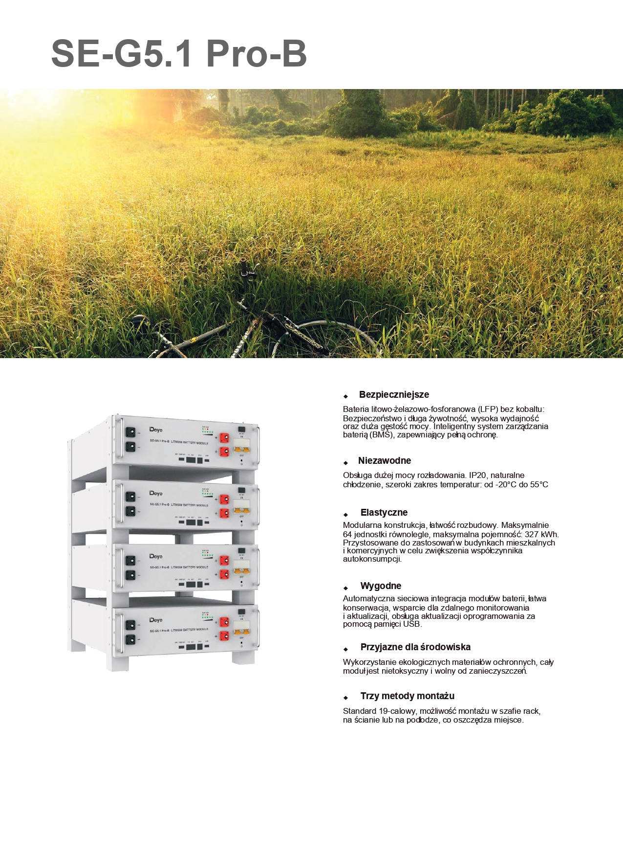 • Niezawodność : SE-G5.1 Pro-B obsługuje dużą moc rozładowania i działa w szerokim zakresie temperatur od -20°C do 55°C. Dzięki stopniowi ochrony IP20 i naturalnemu chłodzeniu ta bateria jest trwała.