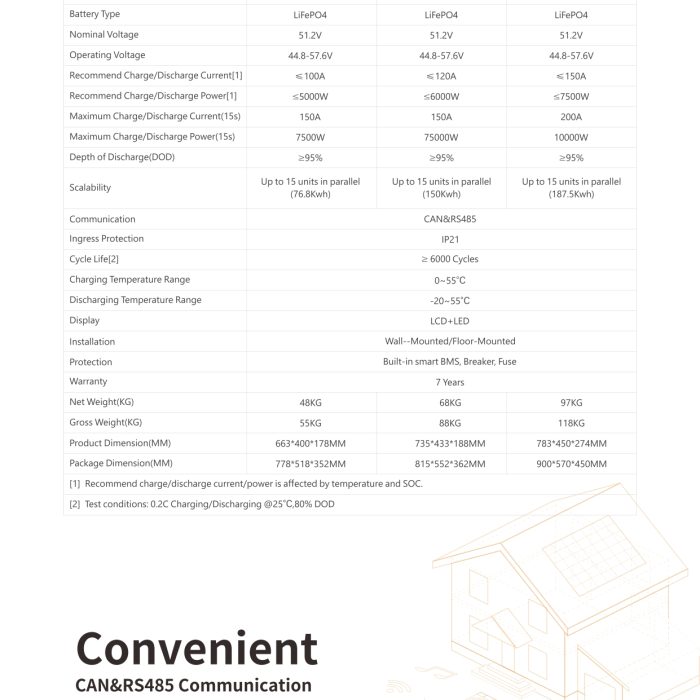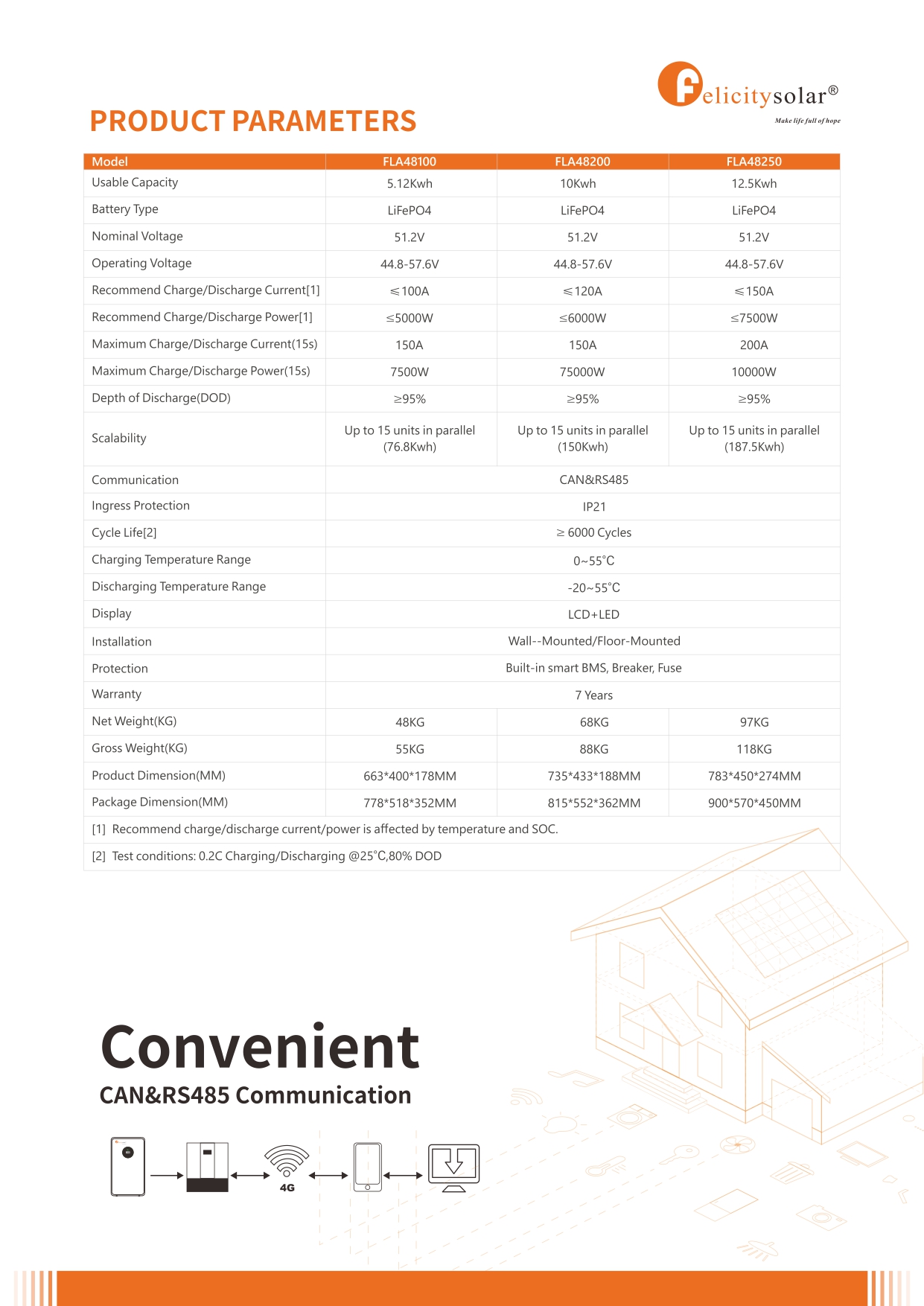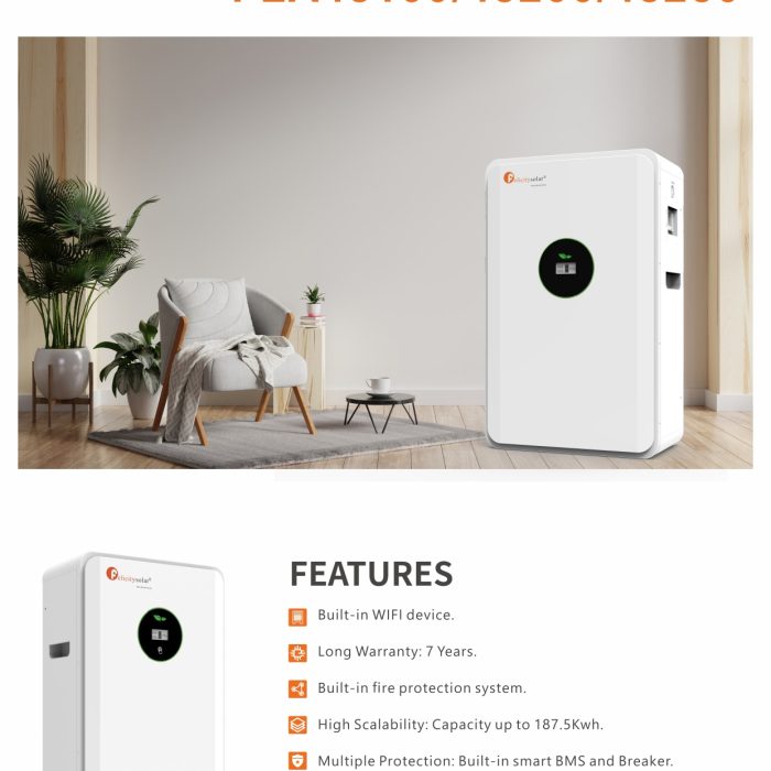 Bateria naścienna FLA, dzięki doskonałej wydajności, bezpieczeństwu i wygodnej instalacji, jest idealnym rozwiązaniem dla Twoich potrzeb energetycznych. Niezależnie od tego, czy chodzi o użytek domowy, komercyjny czy przemysłowy, bateria z serii FLA z łatwością spełni Twoje potrzeby. Zastosowanie zaawansowanej technologii LiFePO4 zapewnia, że akumulator ma wyższą gęstość energii i dłuższą żywotność. Nie ma potrzeby martwić się o niską moc lub częstą wymianę. Wbudowany inteligentny system BMS może monitorować stan baterii w czasie rzeczywistym, aby upewnić się, że bateria działa w bezpiecznym zakresie. Jest również wyposażony w wiele mechanizmów zabezpieczających, takich jak wyłączniki i bezpieczniki, aby jeszcze bardziej zwiększyć bezpieczeństwo akumulatora. Akumulatory o różnych pojemnościach można łączyć w zależności od rzeczywistych potrzeb, aby zaspokoić różne potrzeby w zakresie zasilania. Akumulator FLA 51,2 V 100 Ah o pojemności 5,12 kWh.