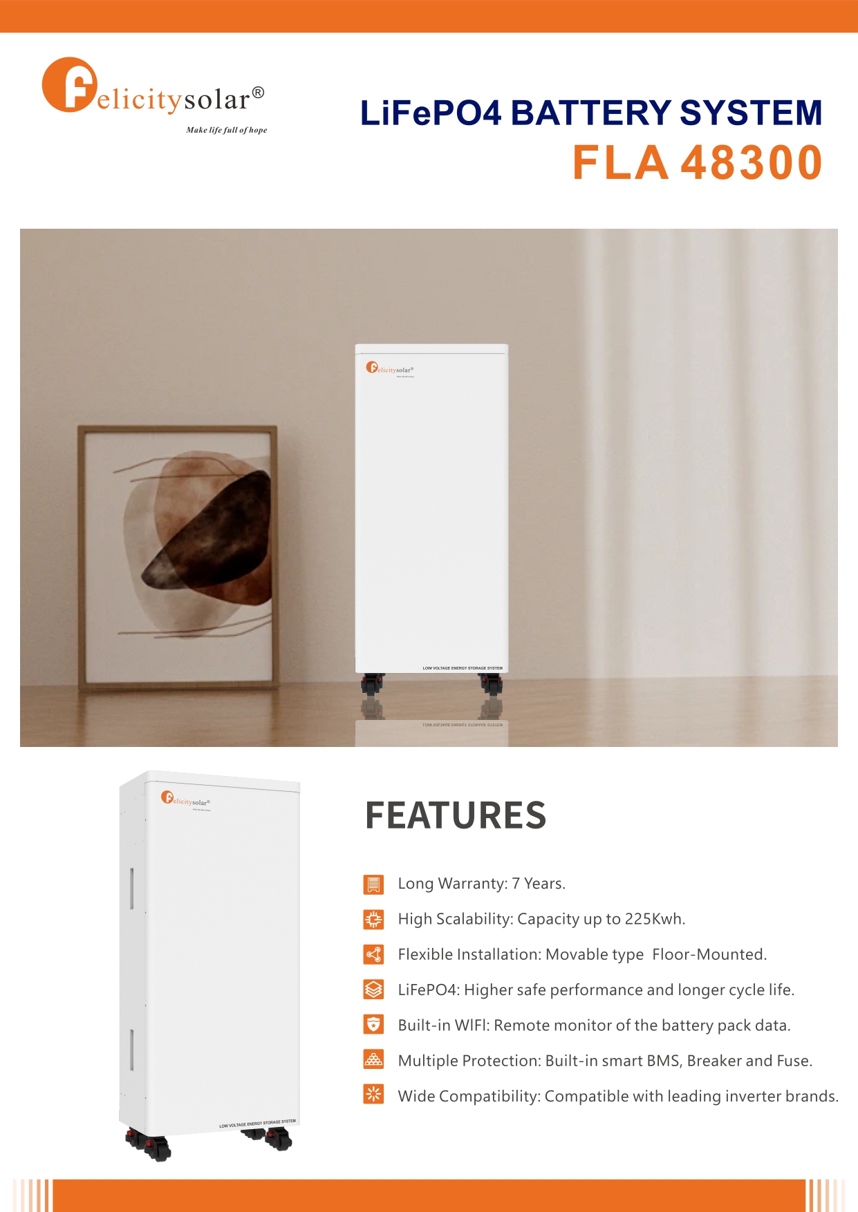 System baterii głównej serii FLS wykorzystuje system energii słonecznej dla domu rodzinnego. Posiada również funkcję kontrolera baterii i chroni nasze zastosowania domowe w odpowiednim czasie. FLS48300 to pionowy akumulator LiFePO4 odpowiedni dla willi, domów jednorodzinnych i innych rodzin o wysokim zapotrzebowaniu na energię; komercyjne zasilanie awaryjne i inne scenariusze zastosowań. Zbuduj system magazynowania energii o wystarczającej pojemności, aby zapewnić stabilne wsparcie zasilania dla różnych scenariuszy zastosowań. Seria FLS ma wbudowany aerozol gaśniczy. W ekstremalnych przypadkach aerozol może szybko ugasić pożar, zapobiec jego rozprzestrzenianiu się i zapewnić bezpieczeństwo mienia użytkowników. Może również pasować do wielu znanych marek falowników. Zapewniamy również użytkownikom 10-letnią gwarancję, dzięki czemu można kupować bez obaw i używać z większą pewnością.