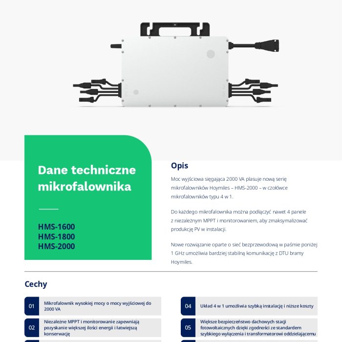 Osiągając moc wyjściową do 1600VA, nowy mikroinwerter Hoymiles HMS-1600 plasuje się w czołówce mikroinwerterów 4 w 1. Do każdego mikroinwertera można podłączyć nawet cztery moduły PV z niezależnym MPPT i monitorowaniem, co pozwala na większą wydajność energetyczną i łatwiejsze użytkowanie.