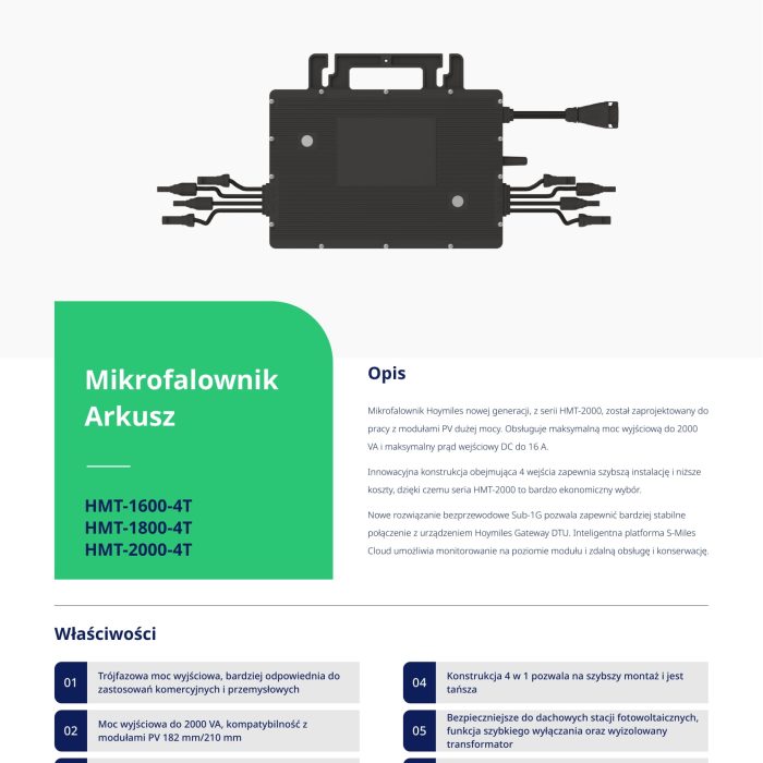 Nowa generacja mikroinwerterów Hoymiles serii HMT-1800 została zaprojektowana z myślą o modułach fotowoltaicznych o dużej mocy, z maksymalną mocą wyjściową do 1800 VA i maksymalnym prądem wejściowym DC do 16 A.