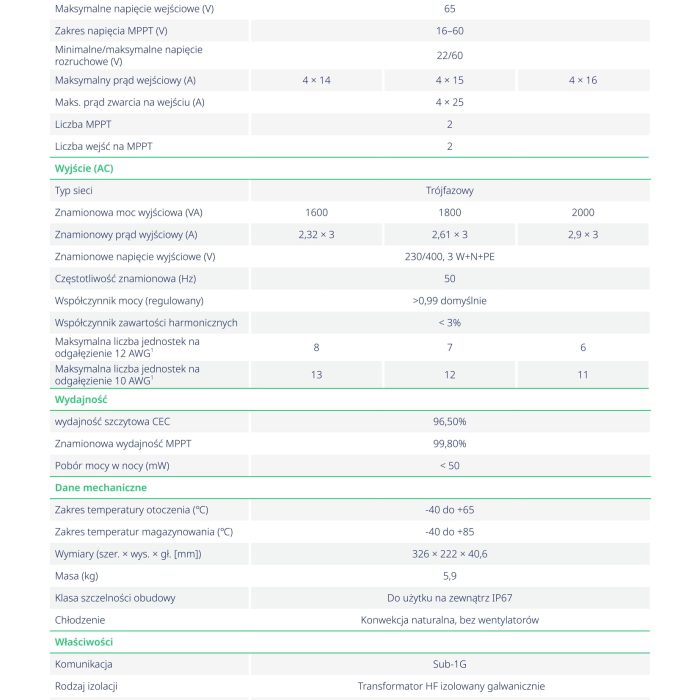 • Zakres napięcia MPPT: 16V–60V